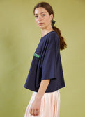 Made in a super soft 100% navy cotton tshirting these tees are gently oversized and come in just the one size which we know works well across all sizes