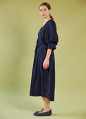 The Road to Nowhere dress has a V neck and a drawstring waist so it can be worn drawn in or loose depending on your preference.  It has a pleated skirt, a pleated sleeve detail and pockets